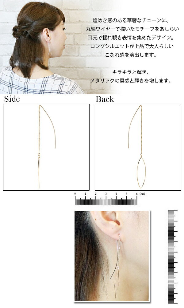 ギフト対応 素材: 真鍮製 プラチナロジウム/ゴールドコーティング アメリカンピアス ニッケルフリー 日本製 サイズ: 全長:縦13cm 横2cm チャーム 飾り 部分:約縦3.5cm 横2cm 厚み0.7mm チェーン:太さ1mm 大ぶりモチーフのアメリカンピアスです。