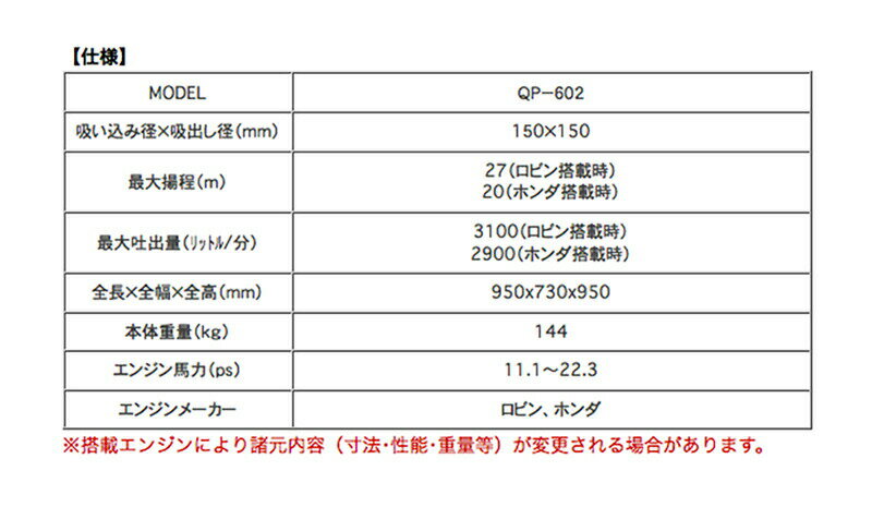 【代引不可:受注後2週間かかります】 6インチ一般灌水ポンプ QP-602R ロビン エンジン 【特長】 1.コンパクトな大容量型6インチポンプ。